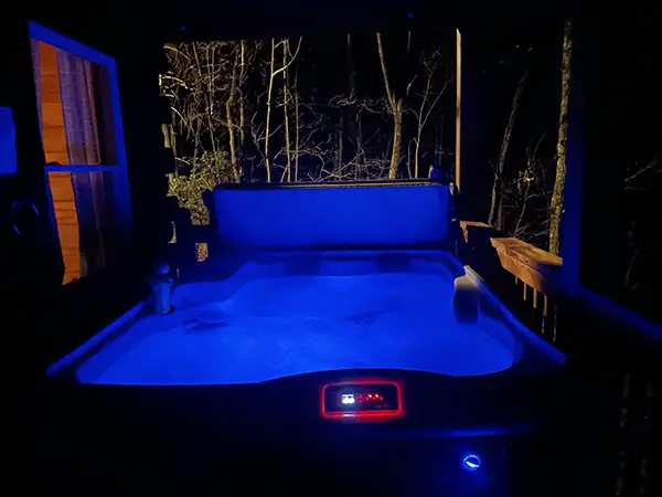 Relax in the hot tub under the stars, surrounded by peaceful mountain woods. Perfect for couples romentic escape, families, or a quiet getaway.
